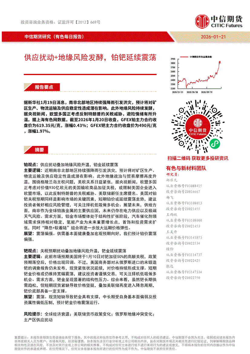 中信期货-有色每日报告:供应扰动+地缘风险发酵,铂钯延续震荡-260121