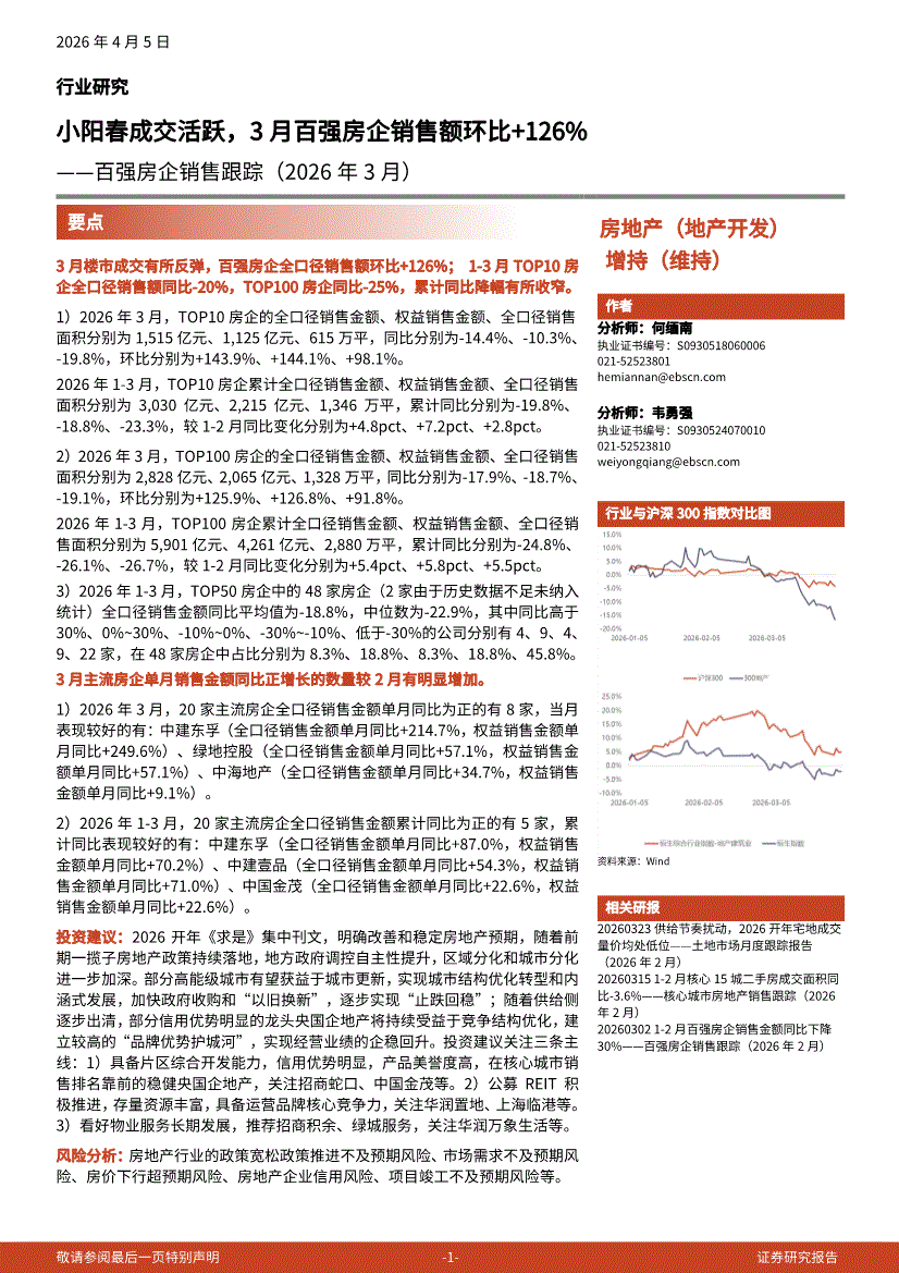 房地产行业:光大证券-房地产行业百强房企销售跟踪(2026年3月):小阳春成交活跃,3月百强房企销售额环比+126%-260405