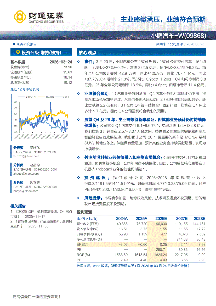 小鹏汽车~W:财通证券-小鹏汽车~W-9868.HK-主业略微承压,业绩符合预期-260325