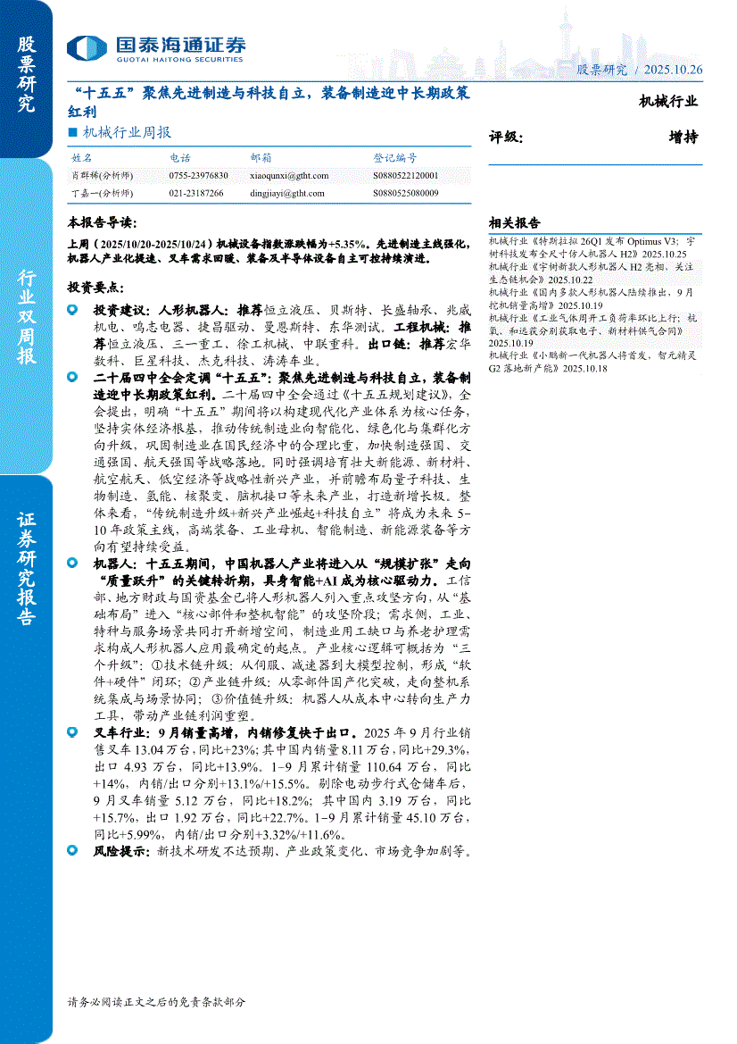 机械行业:国泰海通证券-机械行业周报:“十五五”聚焦先进制造与科技自立,装备制造迎中长期政策红利-251026