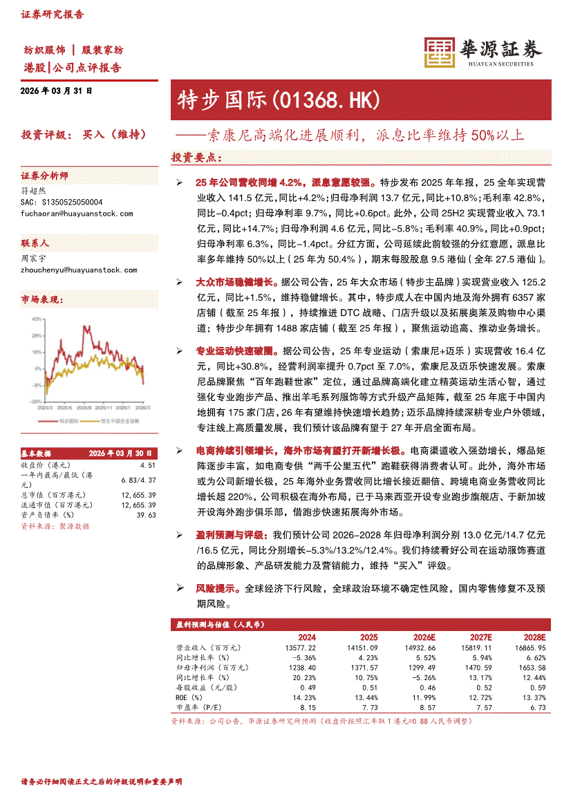 特步国际:华源证券-特步国际-1368.HK-索康尼高端化进展顺利,派息比率维持50%以上-260331