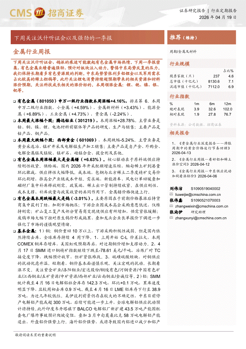 金属行业:招商证券-金属行业周报:下周关注沃什听证会以及强劲的一季报-260419