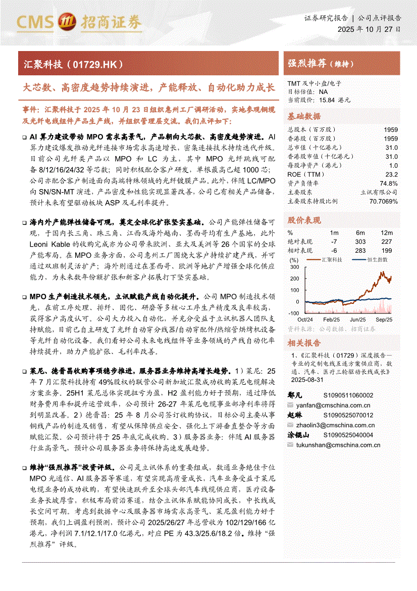 汇聚科技:招商证券-汇聚科技-1729.HK-大芯数、高密度趋势持续演进,产能释放、自动化助力成长-251027