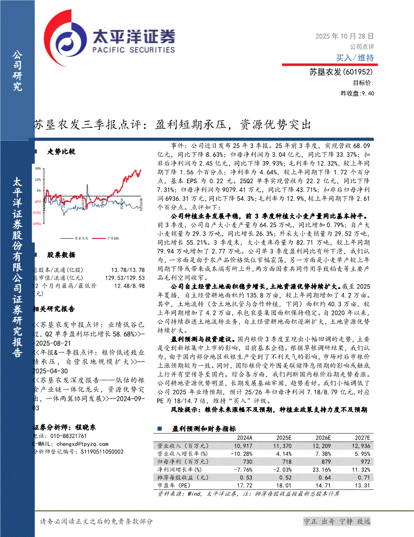苏垦农发:太平洋证券-苏垦农发-601952-三季报点评:盈利短期承压,资源优势突出-251028