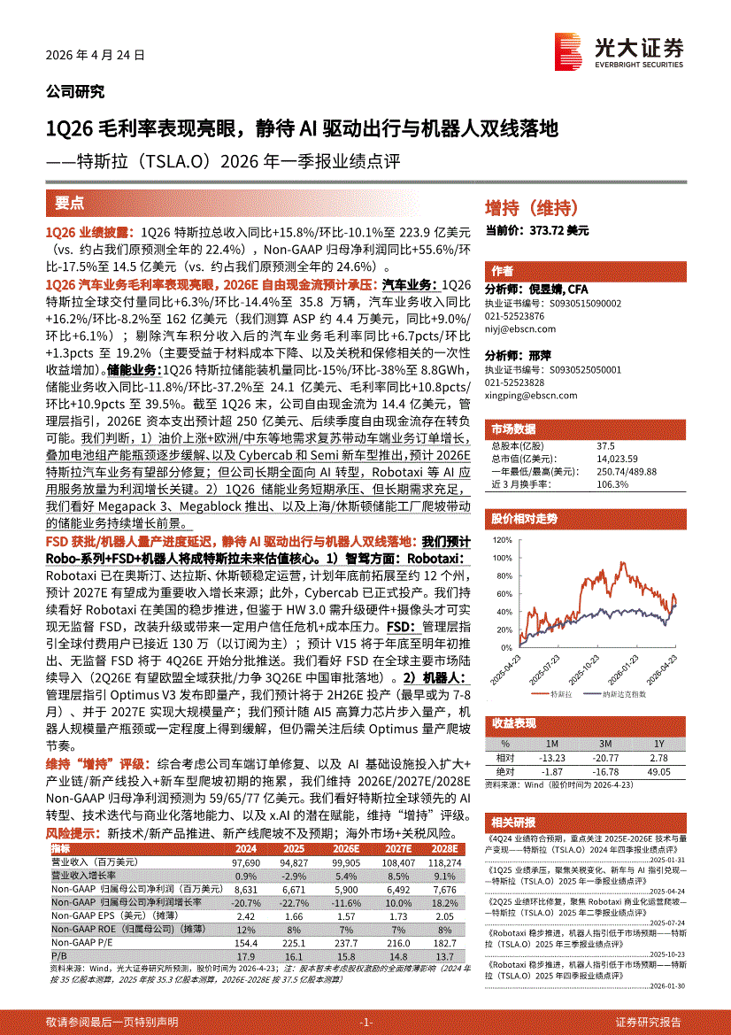 特斯拉:光大证券-特斯拉-TSLA.US-2026年一季报业绩点评:1Q26毛利率表现亮眼,静待AI驱动出行与机器人双线落地-260424