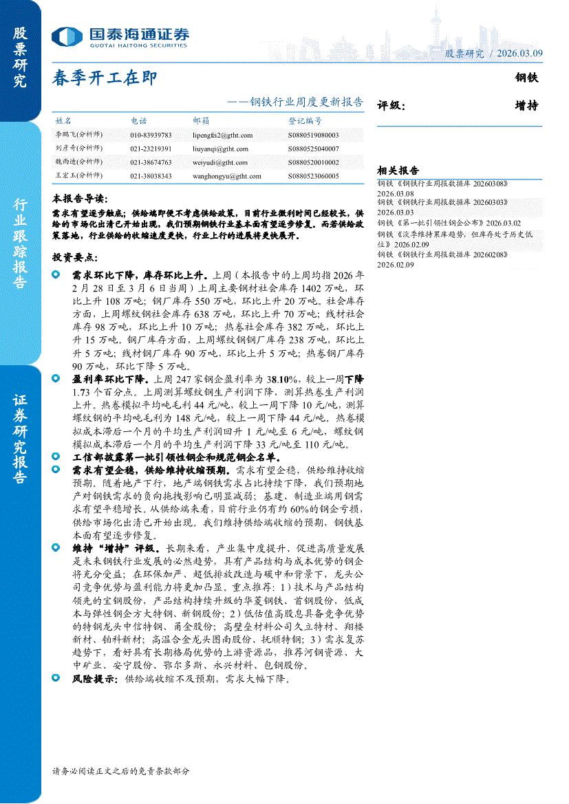钢铁行业:国泰海通证券-钢铁行业周度更新报告:春季开工在即-260309