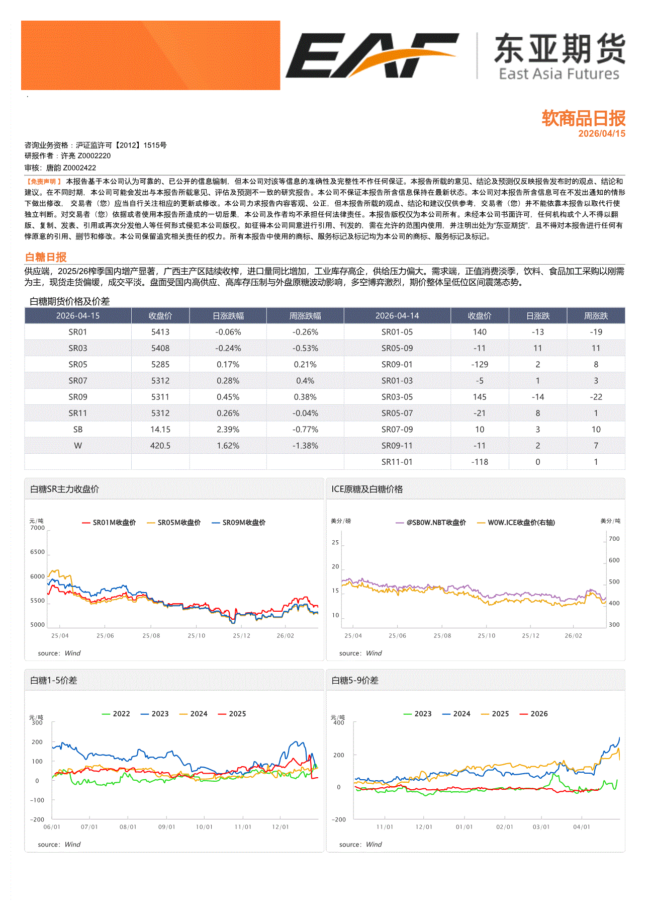 上海东亚期货-软商品日报-260415