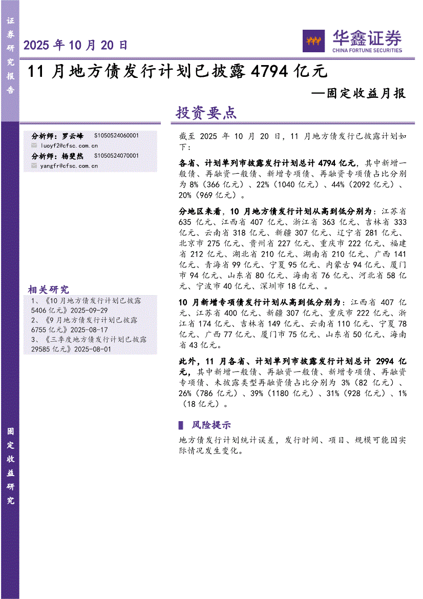 华鑫证券-固定收益月报:11月地方债发行计划已披露4794亿元-251020