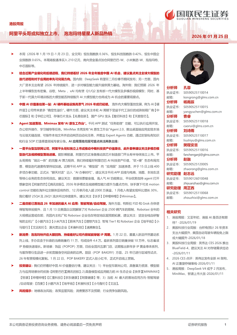 国联民生证券-港股周报:阿里平头哥或拟独立上市,泡泡玛特星星人新品热销-260125