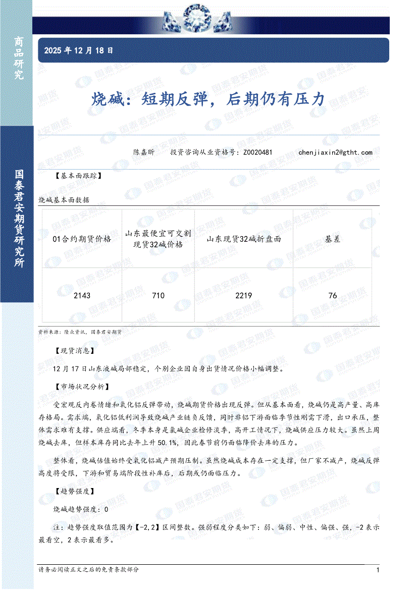 国泰君安期货-烧碱:短期反弹,后期仍有压力-251218