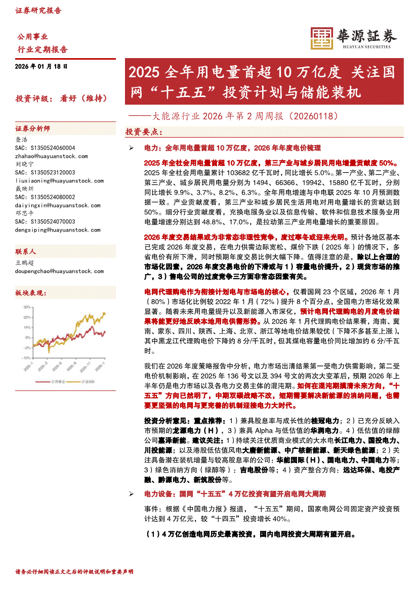 大能源行业:华源证券-大能源行业2026年第2周周报:2025全年用电量首超10万亿度,关注国网“十五五”投资计划与储能装机-260118
