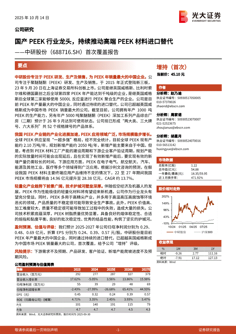 中研股份:光大证券-中研股份-688716-首次覆盖报告:PEEK行业龙头,持续推动高端PEEK材料进口替代-251014