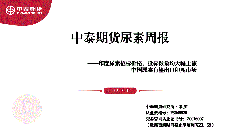 中泰期货-尿素周报:印度尿素招标价格、投标数量均大幅上涨,中国尿素有望出口印度市场-250810