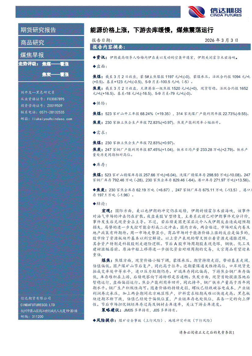 信达期货-煤焦早报:能源价格上涨,下游去库缓慢,煤焦震荡运行-260303