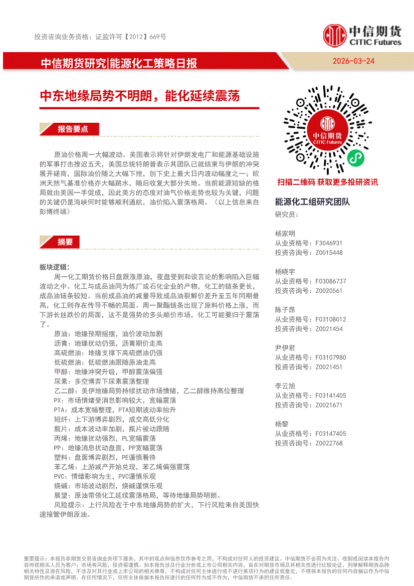 中信期货-能源化工策略日报:中东地缘局势不明朗,能化延续震荡-260324