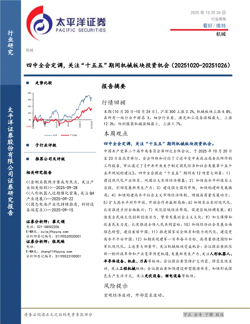 机械行业:太平洋证券-机械行业:四中全会定调,关注“十五五”期间机械板块投资机会-251026