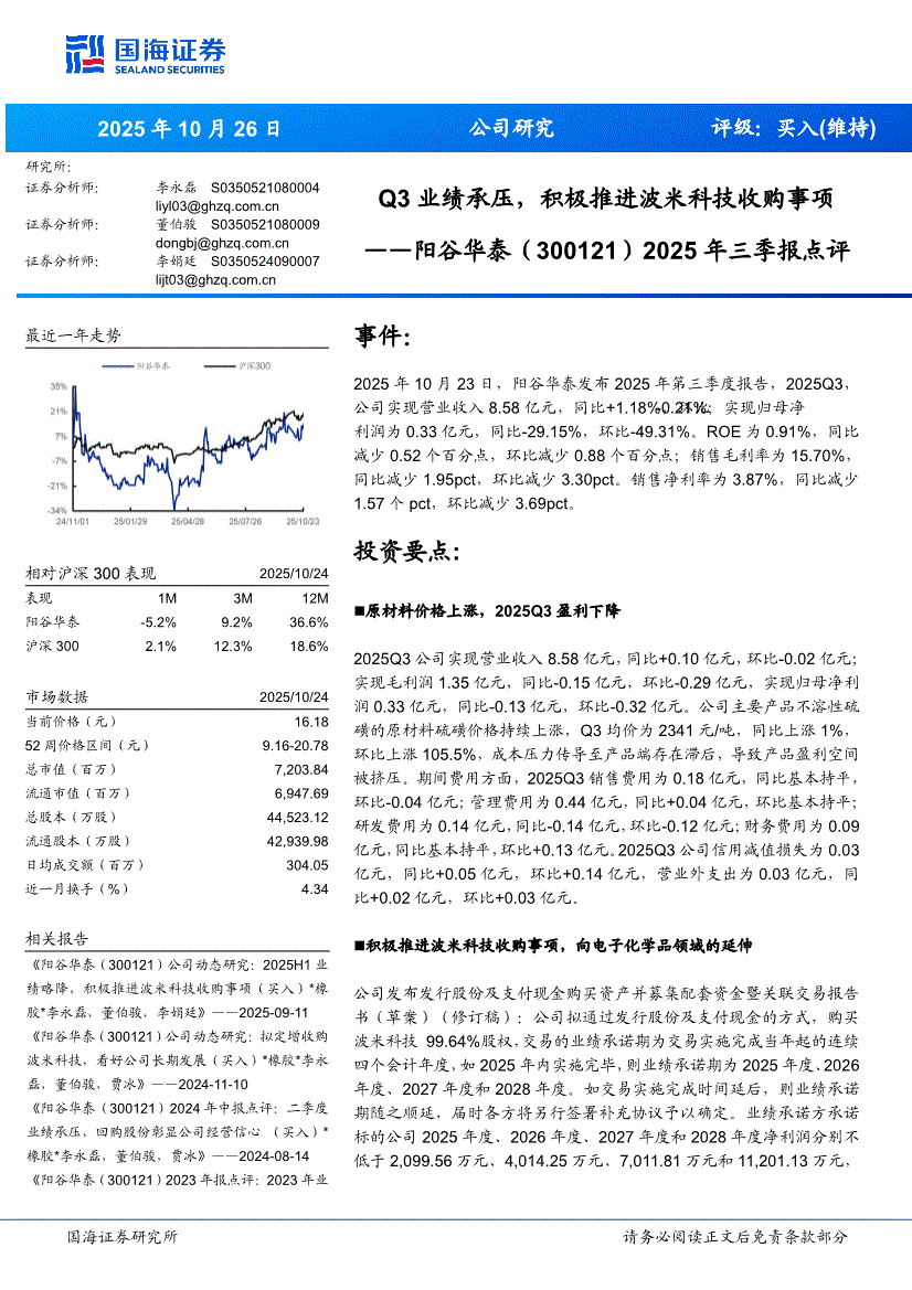 阳谷华泰:国海证券-阳谷华泰-300121-2025年三季报点评:Q3业绩承压,积极推进波米科技收购事项-251026