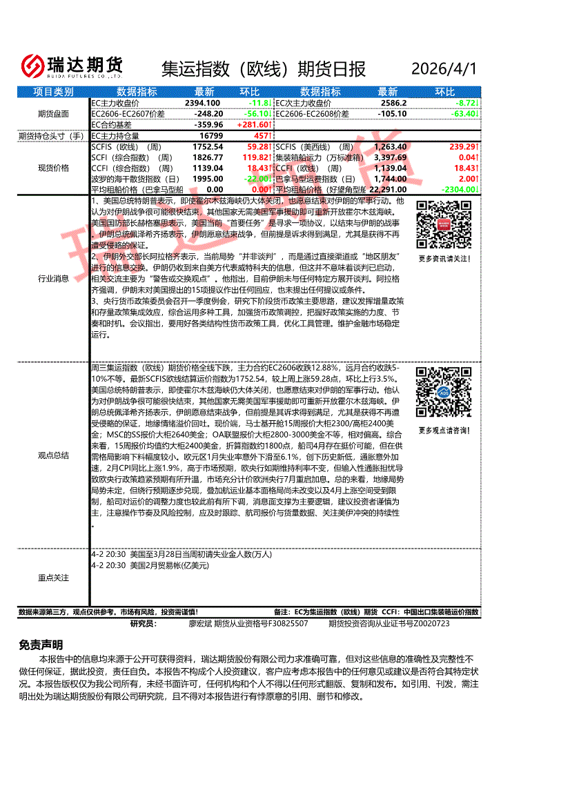 瑞达期货-集运指数(欧线)期货日报-260401