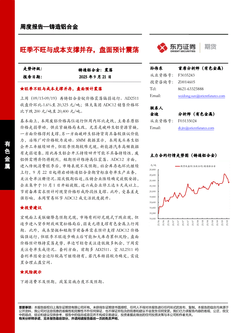 东证期货-铸造铝合金周度报告:旺季不旺与成本支撑并存,盘面预计震荡-250921