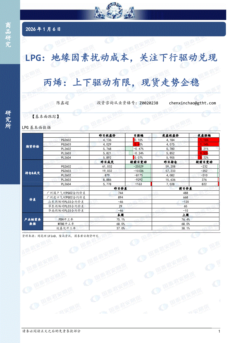 国泰君安期货-LPG:地缘因素扰动成本,关注下行驱动兑现,丙烯,上下驱动有限,现货走势企稳-260106