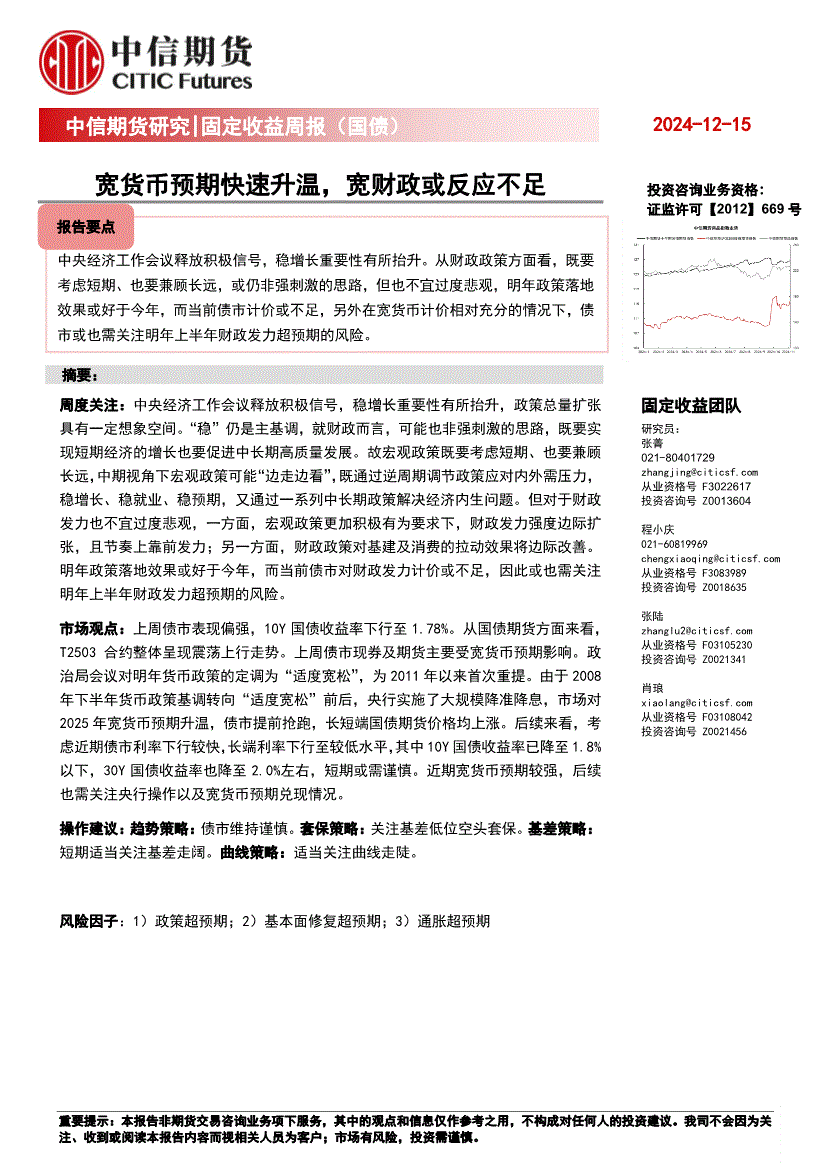 中信期货-固定收益周报(国债) :宽货币预期快速升温,宽财政或反应不足-241215