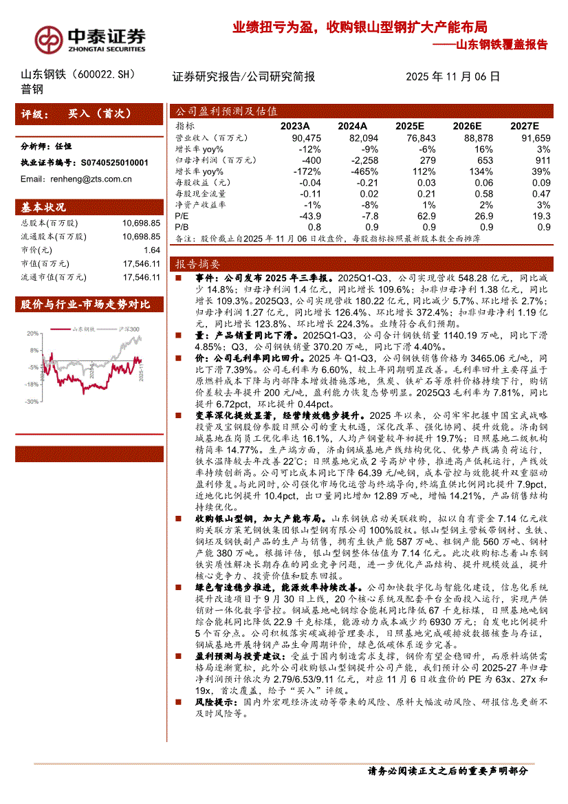 山东钢铁:中泰证券-山东钢铁-600022-覆盖报告:业绩扭亏为盈,收购银山型钢扩大产能布局-251106