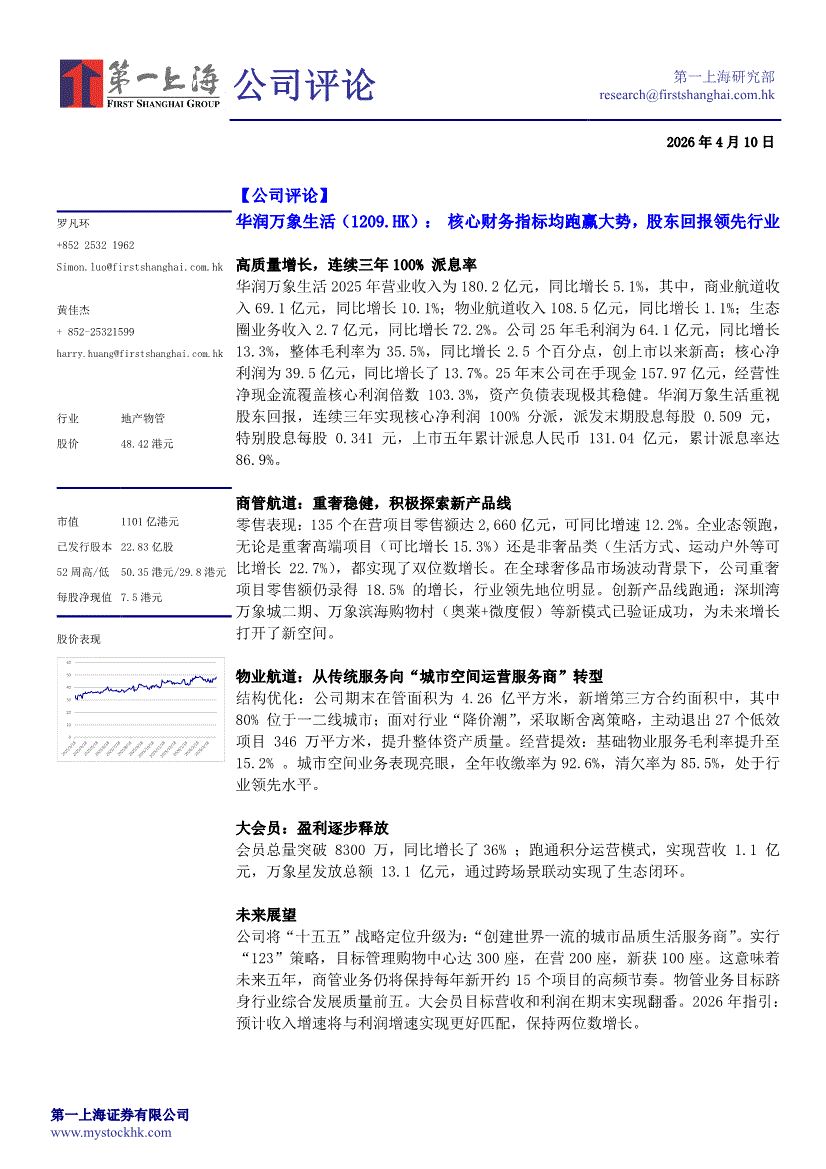 华润万象生活:第一上海-华润万象生活-1209.HK-核心财务指标均跑赢大势,股东回报领先行业-260410
