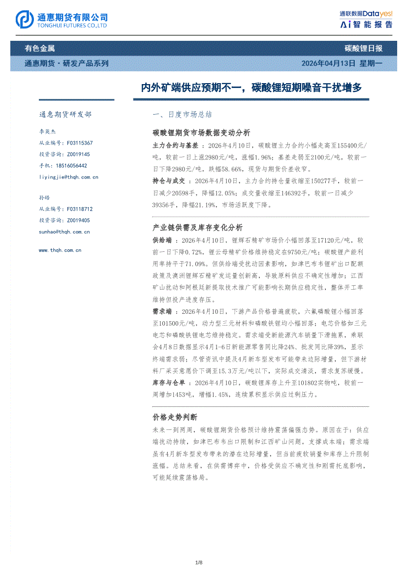 通惠期货-碳酸锂日报:内外矿端供应预期不一,碳酸锂短期噪音干扰增多-260413