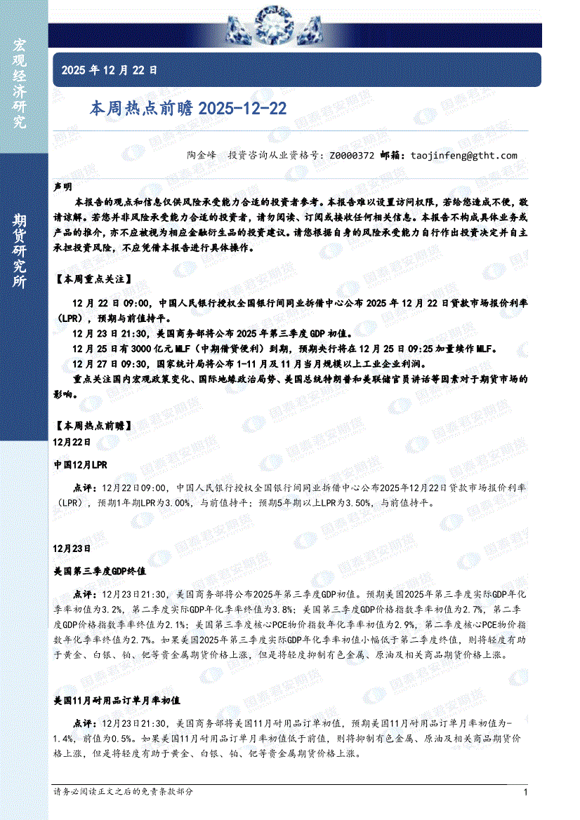 国泰君安期货-本周热点前瞻-251222