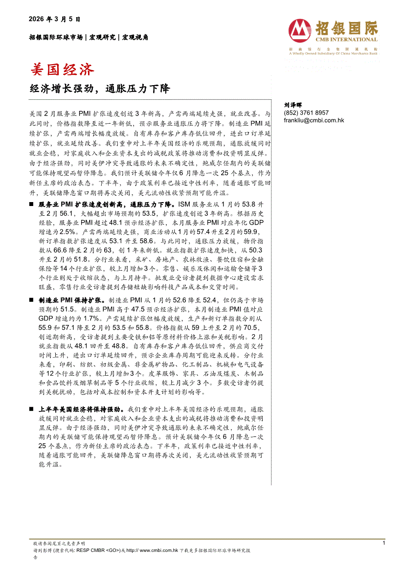 招银国际-美国经济:经济增长强劲,通胀压力下降-260305