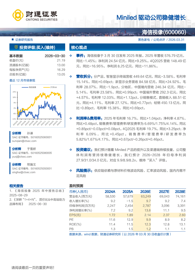 海信视像:财通证券-海信视像-600060-Miniled驱动公司稳健增长-260331