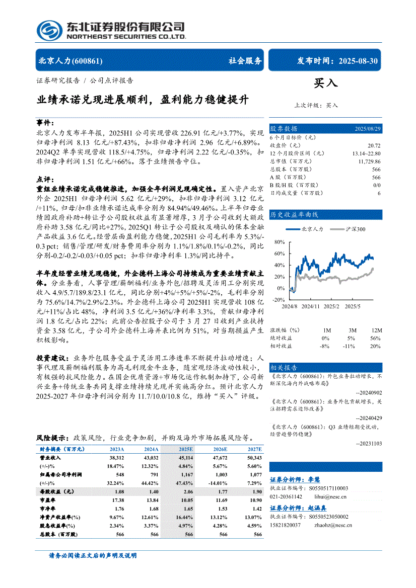 北京人力:东北证券-北京人力-600861-业绩承诺兑现进展顺利,盈利能力稳健提升-250830