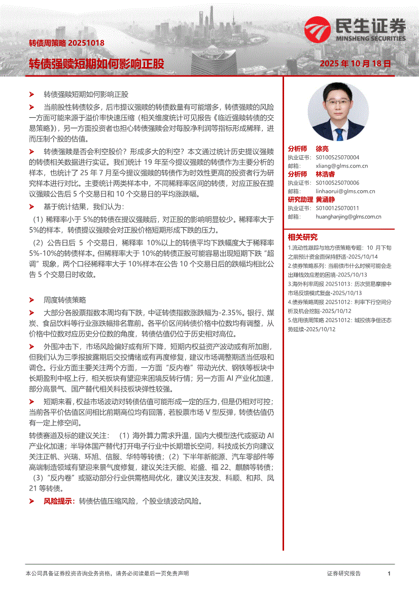 民生证券-转债周策略:转债强赎短期如何影响正股-251018
