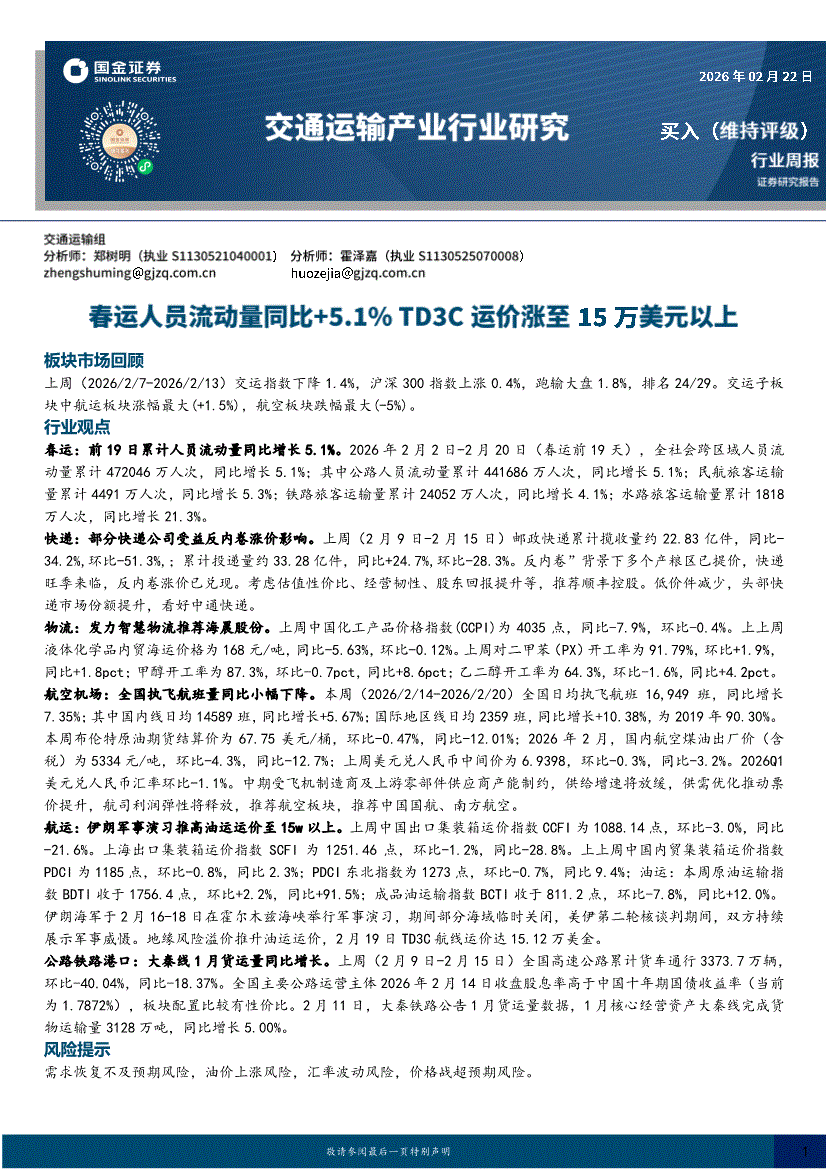 交通运输行业:国金证券-交通运输产业行业周报:春运人员流动量同比+5.1% TD3C运价涨至15万美元以上-260222