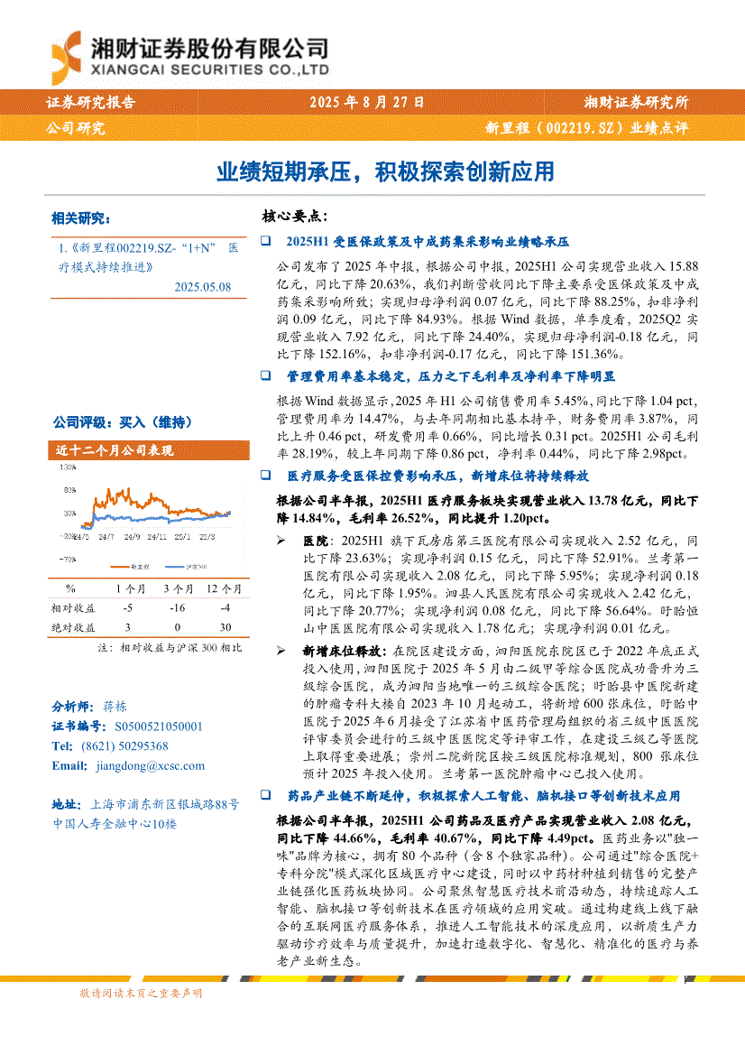新里程:湘财证券-新里程-002219-业绩点评:业绩短期承压,积极探索创新应用-250827