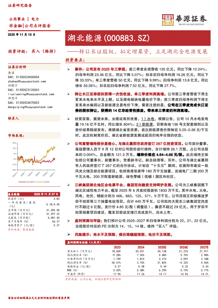 湖北能源:华源证券-湖北能源-000883-转让长证股权、拟定增募资,立足湖北全电源发展-251110