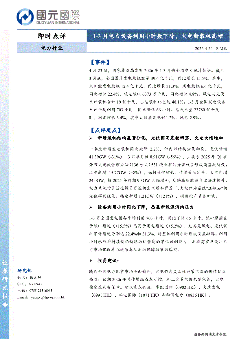 电力行业:国元国际-电力行业:1~3月电力设备利用小时数下降,火电新装机高增-260424