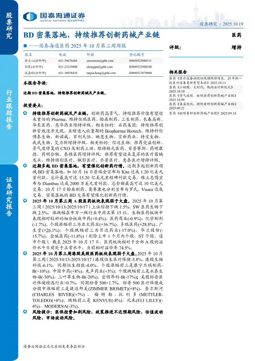 医药行业:国泰海通证券-医药行业2025年10月第三周周报:BD密集落地,持续推荐创新药械产业链-251019