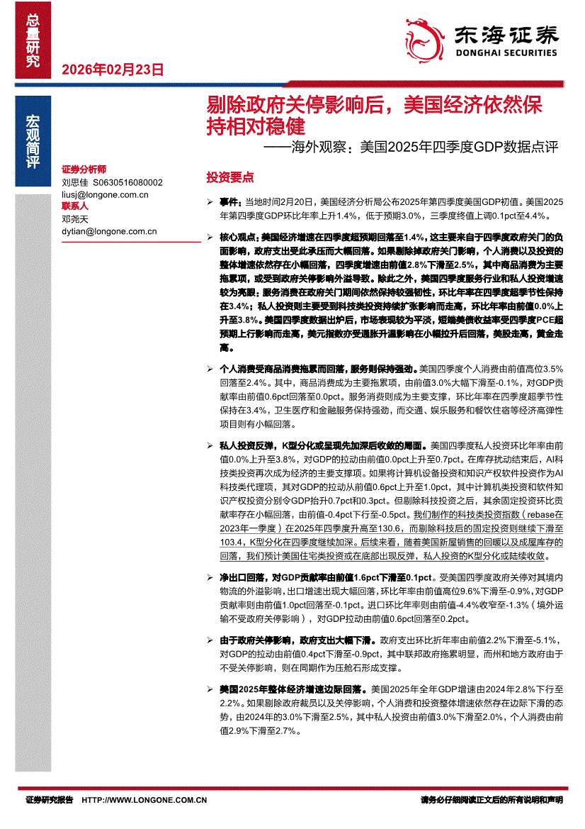 东海证券-海外观察:美国2025年四季度GDP数据点评,剔除政府关停影响后,美国经济依然保持相对稳健-260223