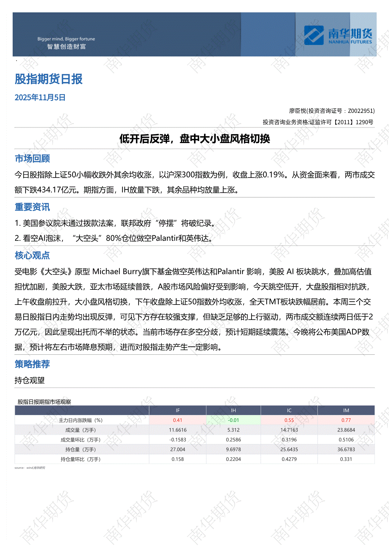 南华期货-股指期货日报:低开后反弹,盘中大小盘风格切换-251105