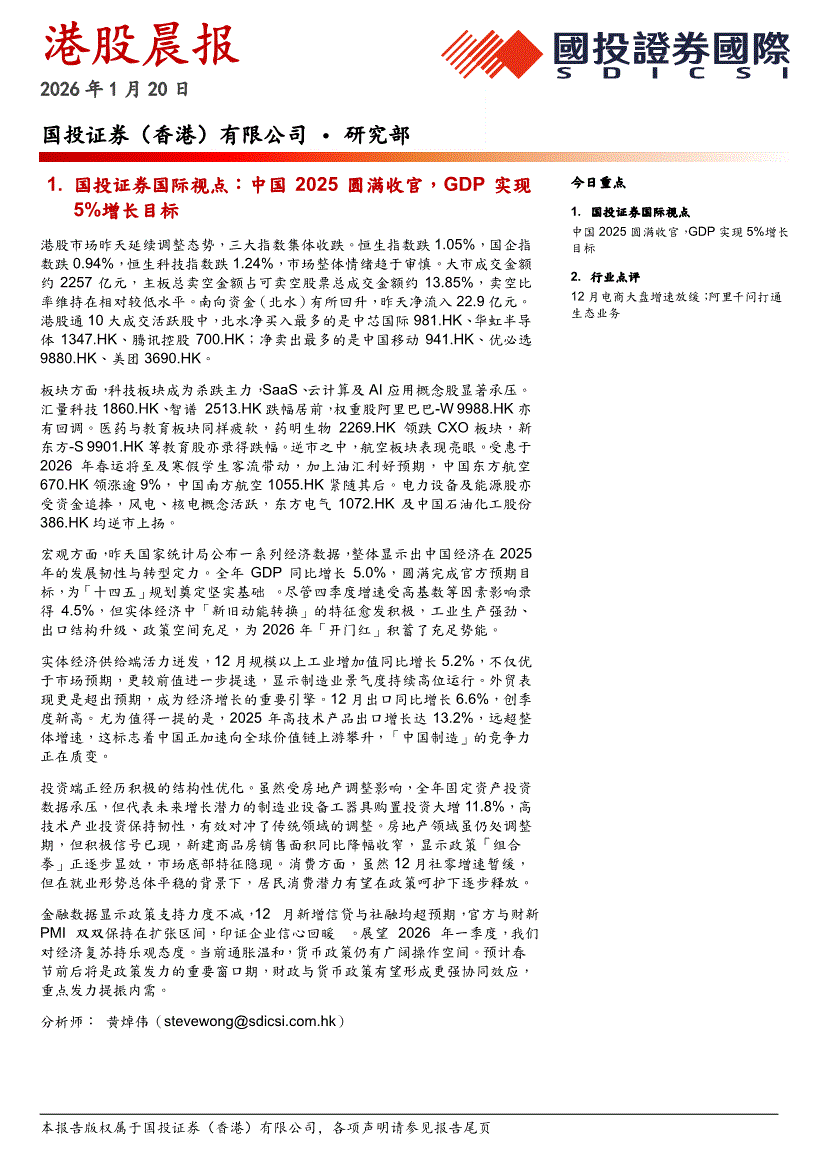 国元国际-港股市场周报:美联储降息预期减弱,短期内港股或有震荡-260119