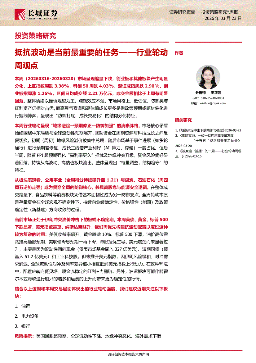 长城证券-投资策略研究:抵抗波动是当前最重要的任务——行业轮动周观点-260323