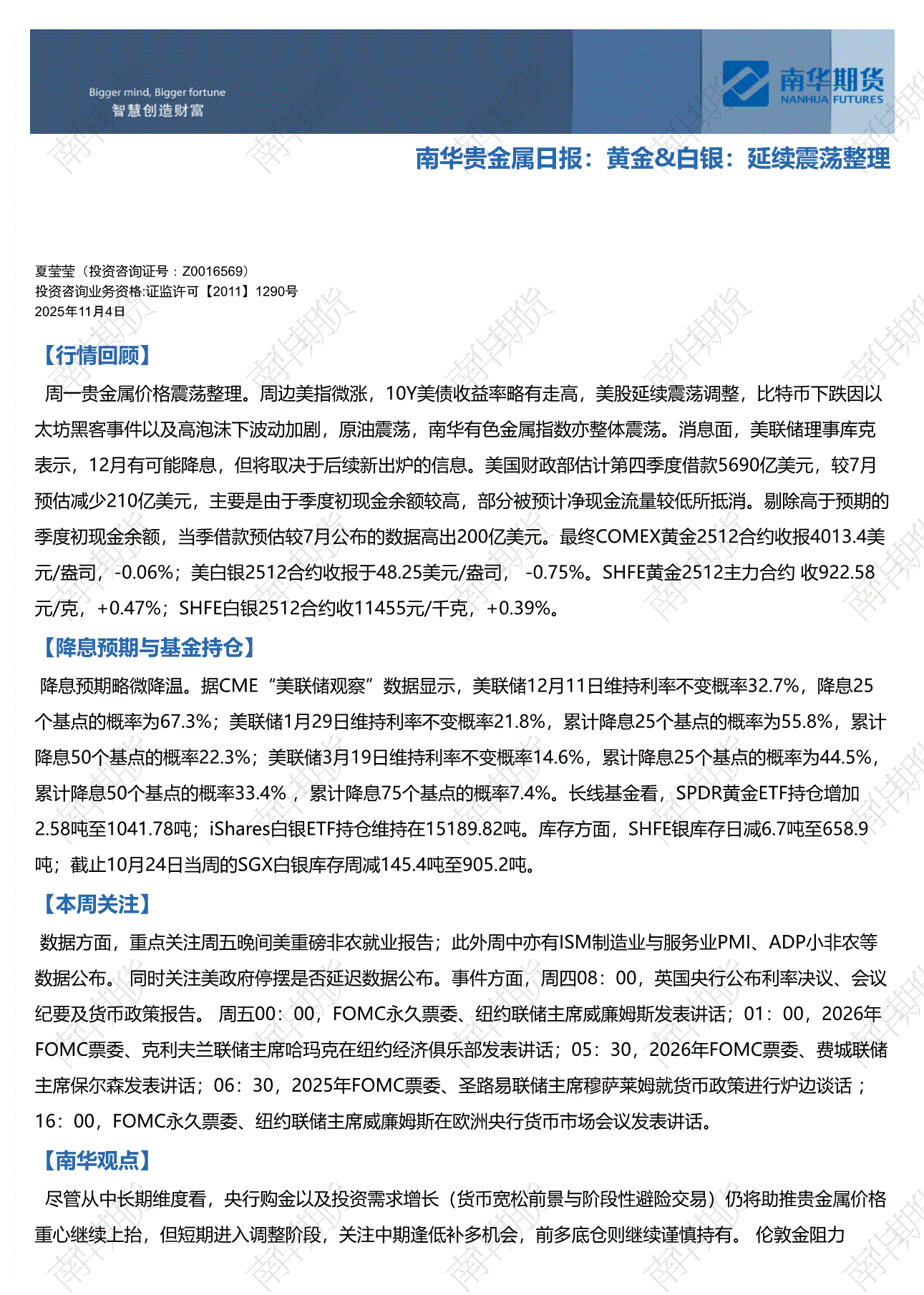 南华期货-贵金属周报:美联储FOMC落地,贵金属延续调整-251101