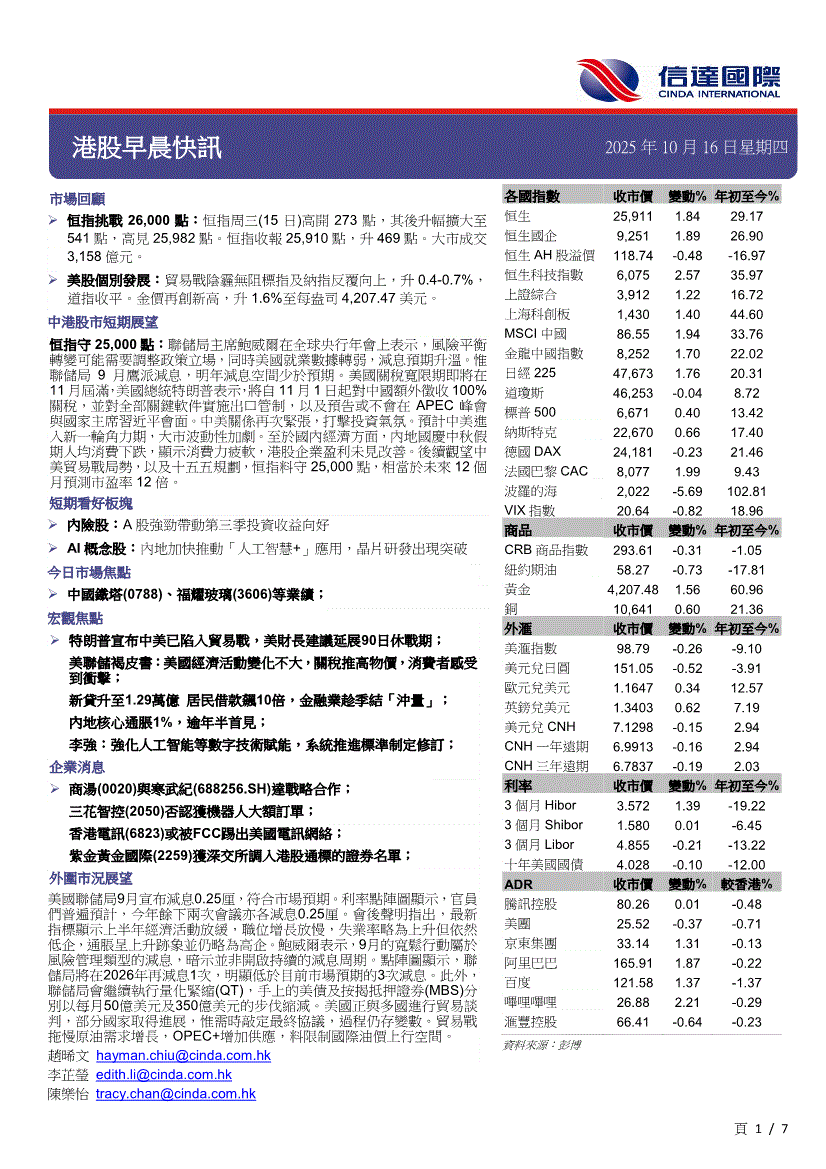 信达国际-港股早晨快讯-251016