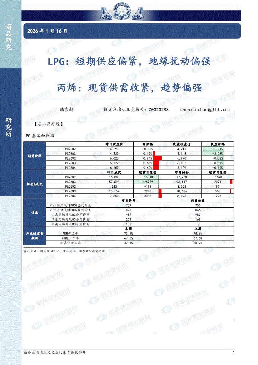国泰君安期货-LPG:短期供应偏紧,地缘扰动偏强,丙烯,现货供需收紧,趋势偏强-260116