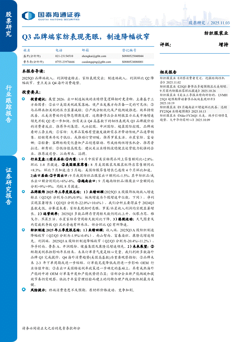 纺织服装行业:国泰海通证券-纺织服装行业:Q3品牌端家纺表现亮眼,制造降幅收窄-251103