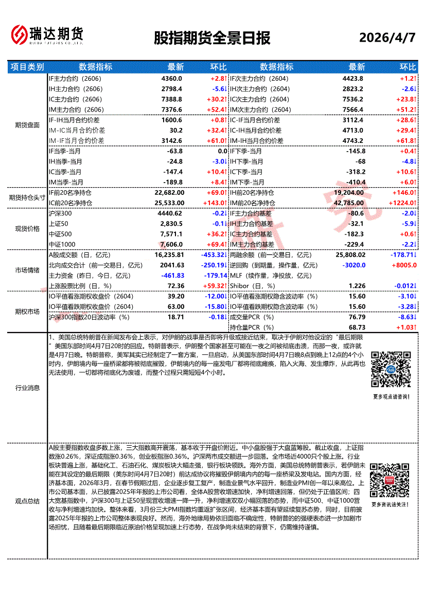 瑞达期货-股指期货全景日报-260407