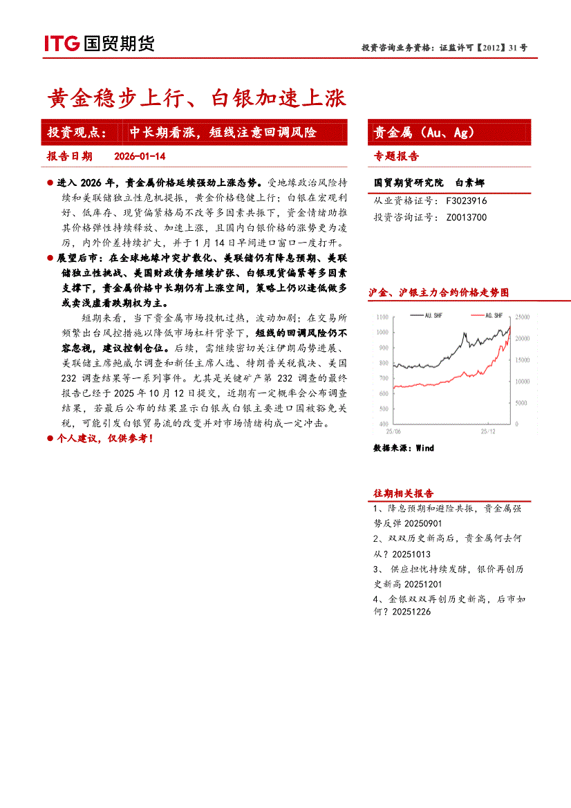 国贸期货-贵金属(Au、Ag)专题报告:黄金稳步上行、白银加速上涨-260114