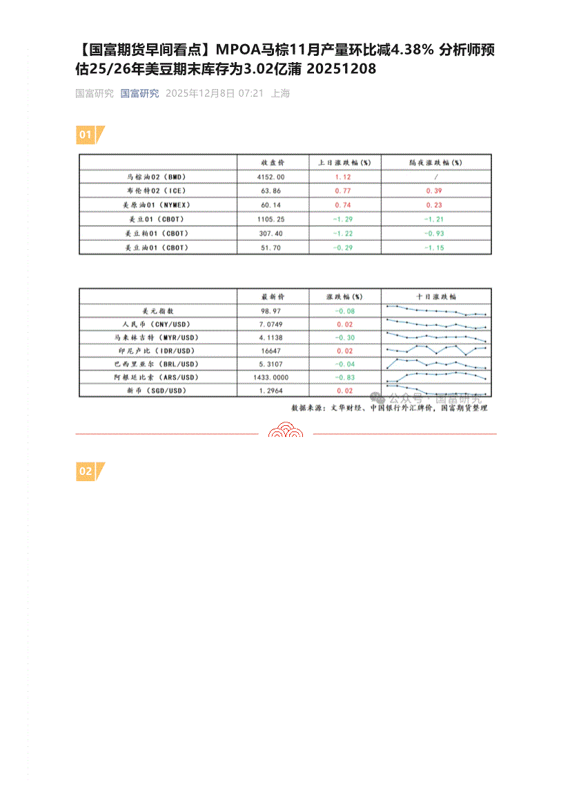 国富期货-【早间看点】MPOA马棕11月产量环比减4.38%,分析师预估25/26年美豆期末库存为3.02亿蒲-251208