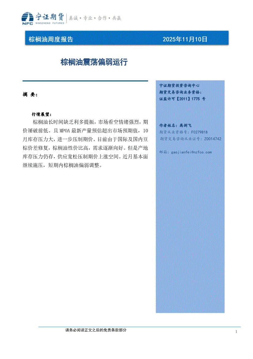 宁证期货-棕榈油周度报告:棕榈油震荡偏弱运行-251110
